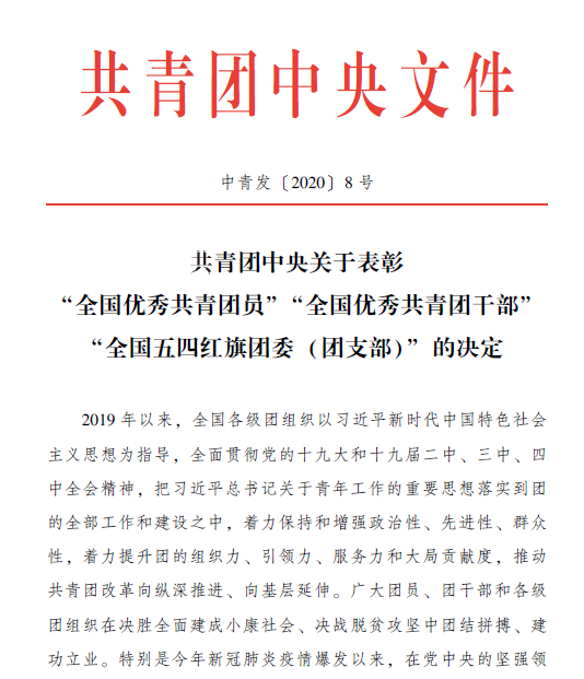 荣获“全国优秀共青团员”称号,这是共青团中央授予团员的最高荣誉。