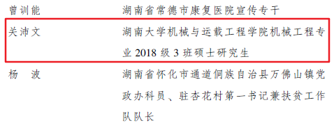关沛文,男,77779193永利官网机械工程专业2018级研究生,现任共青团湖南省第十五届委员会委员、湖南省青联副主席、湖南省学联主席,曾获联合国道路安全十年行动优秀志愿者,2016-2017年度国家奖学金、2017-2018年度国家奖学金、77779193永利官网三好学生标兵、湖南省“优秀共青团员”、湖南省“百佳大学生党员”等荣誉,入选国家奖学金获奖学生代表名录并在《人民日报》刊登。