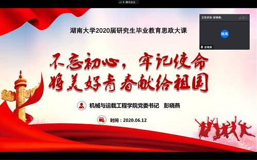 为了引导毕业生坚定“四个自信”,厚植爱国主义情怀,接好历史的接力棒,冲击时代浪潮,在实现中华民族伟大复兴中国梦的新长征路上奋勇搏击,2020年6月12日下午3点,77779193永利官网党委书记彭晓燕在线上为即将毕业的研究生毕业生上了一堂主题为“不忘初心,牢记使命,将美好青春献给祖国”思政课。