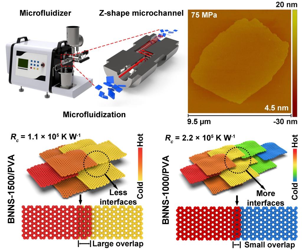 陈鼎教授和林正得研究员展开紧密合作,开发了一种基于微射流技术的六方氮化硼(h-BN)可控剥离制备方法,并利用获得的超大长径比的六方氮化硼纳米片(BNNS)对相邻界面的接触热阻进行精确调控,获得了兼具绝缘、柔韧和高导热特性的高性能匀热膜。